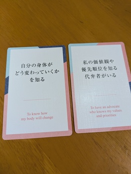 ある日、もしバナ(人生の最期どう在りたいか)をみんなでやった時、Kさんが選んだカードは「自分の身体がどう変わっていくのか知る」「私の価値観や優先順位を知る代弁者がいる」でした。医療関係者から「何もわからなくなった人」と決めつけられ、Kさんの透析治療の事なのにKさんに意向を聞く事もされなかった。その人が選んだカードがこれです。最近、転院した事もありカンファレンスがあった際、Kさんも参加するように調整してもらいました。カンファレンス参加する前に「透析治療はKさんにとっては苦痛を伴っているけれど、止める気はないのか」「透析を止めるとどうなるか知っているか」など話をしました。Kさんはまだまだ生きたいと思っている事、痛みは軽くしてほしいという希望を持っている事を教えてくれたので、「それを病院の人達に話してきた方がいい」と伝えました。カンファレンスでは私と話した時のように上手くは伝えられなかったようですが、杉本ケアマネが橋渡ししながら想いは共有できたようです。Kさんに「行って良かったか、悪かったか」聞いたところ「良かったよ」との返事。